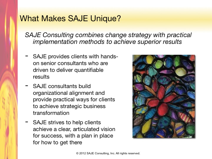 With over 50 years of combined experience, the leadership of SAJE Consulting has developed a proven system for getting to the heart of issues and successfully implementing positive change. For more information, contact us.